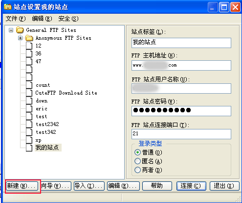 3,我站点设置中点“新建”,站点标签任意设置一个名字,FTP主机地址填自己的域名; 填入ftp站点用户名称和密码,ftp连接口用默认的21,登录类型选择为“普通”。 填完后点